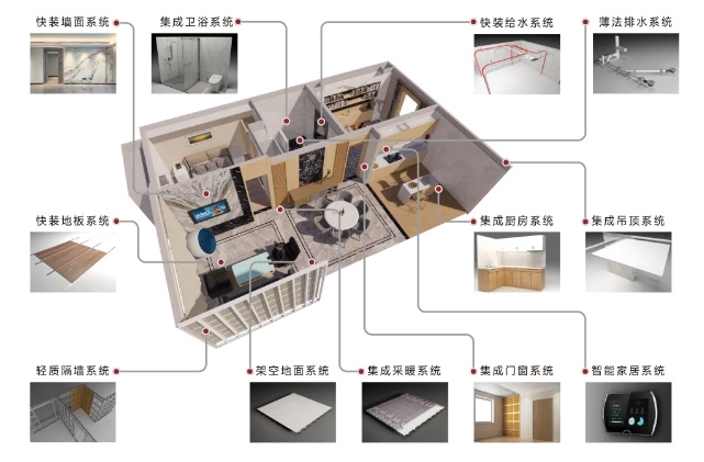 內(nèi)裝修拆分為各自獨(dú)立的部品體系,各部分可工廠生產(chǎn),現(xiàn)場(chǎng)干法裝配。構(gòu)造體系基本可以概括為支撐構(gòu)造+調(diào)平構(gòu)造+填充構(gòu)造+連接構(gòu)造+集成飾面實(shí)現(xiàn)支撐功能、調(diào)節(jié)功能、連接功能、修飾功能和附加功能。