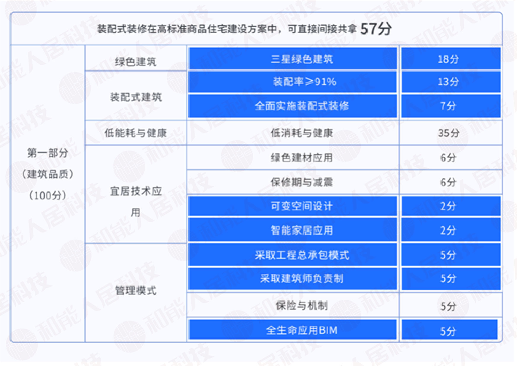 從首輪出讓條件的高標準評分表來看,裝配式建筑板塊,裝配式裝修不僅在“全面實施裝配式裝修”項直接拿7分,在91%裝配率方面直間接可拿到48%的裝配率。在整體建筑品質(zhì)部分的100分中,裝配式裝修可直接、間接助力高標準商品住宅建筑品質(zhì)拿57分,在高標準商品住宅評分標準中有著舉足輕重的作用。